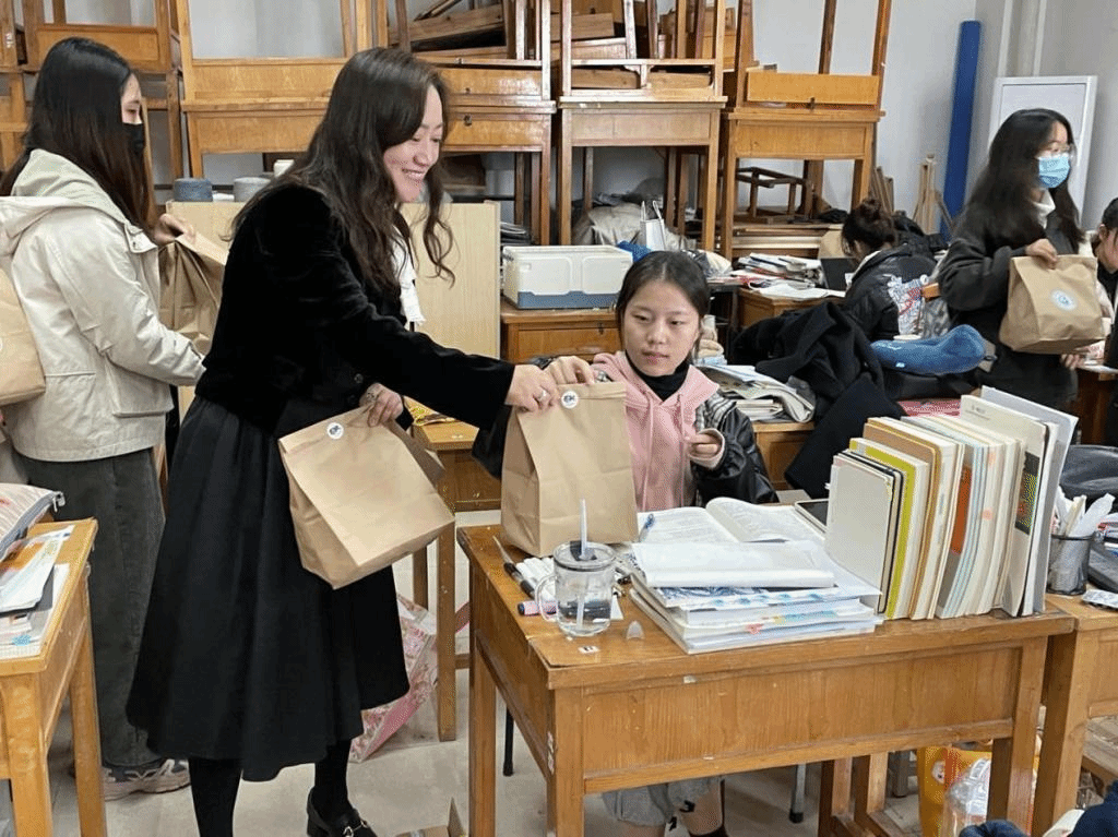 在鼓舞动员环节之后,院长于斌和副院长苏淼向在座的考研学生发放了学院特别定制的考研“福袋”。福袋里不仅包含着补充能量的各种“暖胃美食”,还有学院学生工作办公室为全体考研学子写的一封封“暖心信件”。质朴简单的文字表达了全院所有教师对考研学子金榜题名的真挚祝福,在座的考研学生纷纷表示备受鼓舞,信心十足。