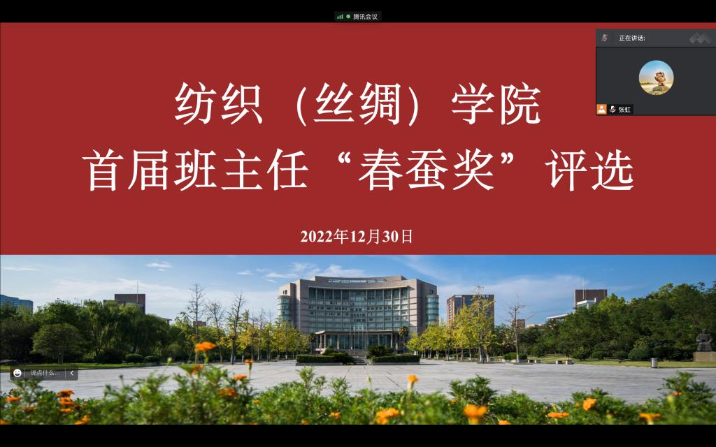 (国际丝绸学院)以线上评选的方式举行学院首届班主任“春蚕奖”的评选活动。学院本科生、研究生班主任共15名老师参加此次评选活动,学院党委副书记方平、学院学工办辅导员和部分学生代表参会。