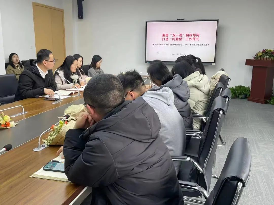 为深入贯彻党的二十大精神,践履“育人的根本在于立德”的精神要义,创新思政工作实践与发展机制,2月22日中午,纺织(丝绸)学院在17号楼312室举行2023年“立德树人”揭榜挂帅专项工作会,在新学期、新开局中亮出破题精神,参加活动的有学院党委副书记、纪委书记方平,本科班主任代表和全体辅导员,学工办主任侯霞主持会议。