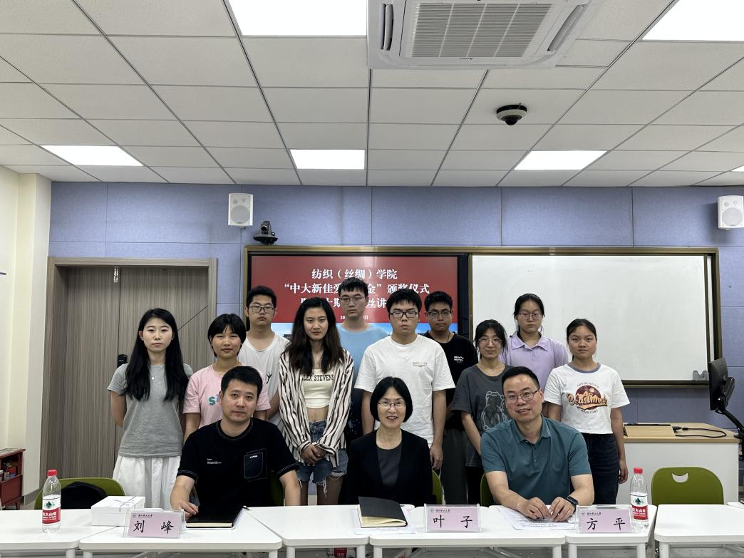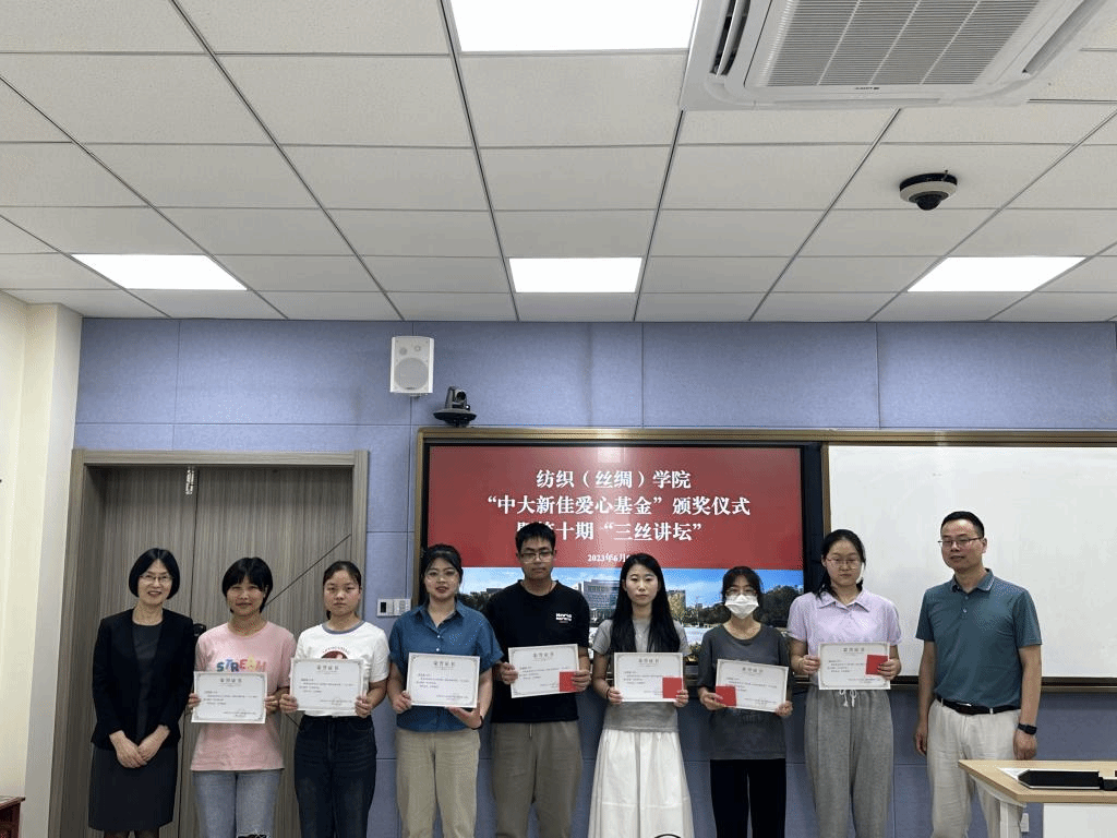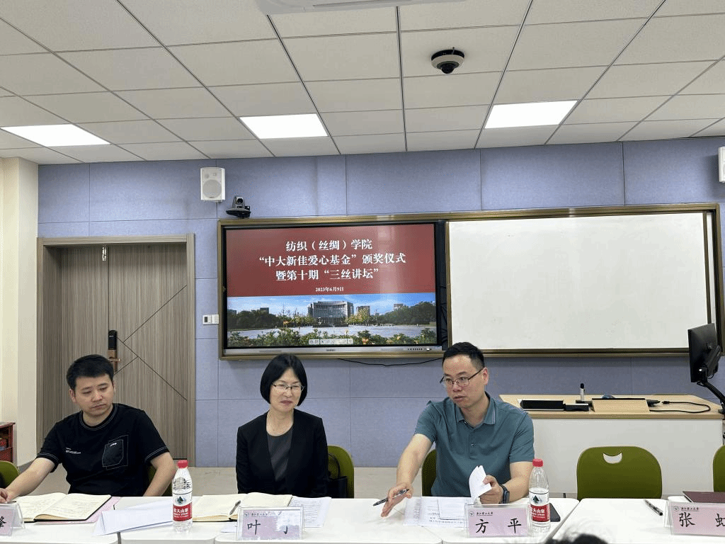 (国际丝绸学院)“中大新佳爱心基金”颁奖仪式暨第十期“三丝讲坛”—校友导师面对面座谈交流会中,中大新佳奖助学金获得者代表们围绕学业、就业、职业规划等主题纷纷提问,82届校友、浙江中大新佳贸易有限公司董事长叶子一一耐心解答。学院党委副书记方平、资助中心辅导员张虹、校友联络中心辅导员袁紫琳一同参加,活动由方平主持。