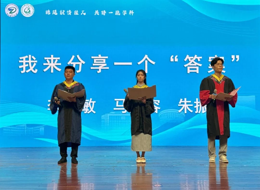 学院本硕博毕业生代表李慧敏、马江容、朱振琦做主题发言《我来分享一个“答案”》。初来乍到时,你有怎样的人生之惑?来到浙理纺织,你又收获了怎样的答案?李慧敏的“自信、大方、真诚、热爱”,马江容的“下笨功夫、下苦功夫”,朱振琦的“坚持”,都是自己在浙理觅得的答案,他们情真意切的发言引发现场师生共鸣和思考。