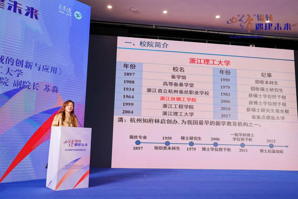 (国际丝绸学院)副院长苏淼向与会人员介绍了学院人才培养、新材料科研等情况并就校企合作提出路径与方法。