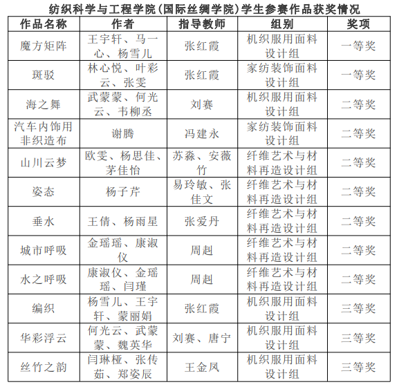 本届大赛,在各高校的积极参与和认真组织下,收到了来自全国48所纺织服装院校和1所国外院校提交的1714多项参赛作品。在上述六个组别中,评选出了559件获奖作品,其中特等奖1项,一等奖59项,二等奖169项,三等奖330项。大赛作品充分展示了中国纺织类高校人才培养教学成果和纺织类高校大学生的创新灵感和设计能力。