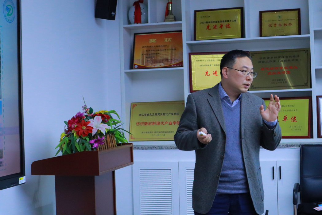 于斌教授汇报省级产业学院——纺织新材料现代产业学院建设情况。他介绍产业学院通过政校行企多方联动,以全过程校企深度融合为轴线,建立“三跨协同”教学模式、“三教融合”培养机制、“三链递进”培养体系,着力培养适应和引领现代纺织业发展需求的应用型、创新型、复合型工程科技人才,实现人才培养与纺织产业协同发展。