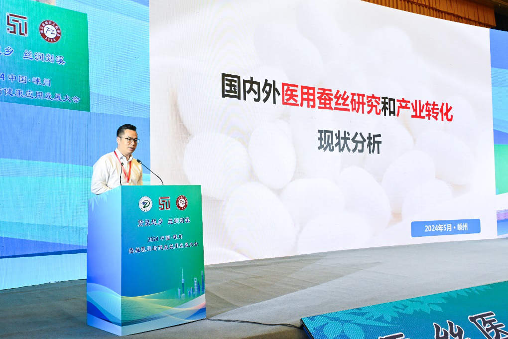 副校长、浙江大学教授欧阳宏伟作《国内外医用蚕丝研究现状分析》报告,欧阳教授从蚕丝的生物相容性、蚕丝健康应用研究、蚕丝健康产业转化三个方面进行分享,着重分析近30年来蚕丝在生命健康领域的应用研究趋势,预期蚕丝材料将在未来生命健康领域的应用掀起革命性浪潮。