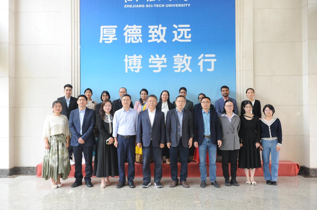 副校长郭玉海,科学技术处专聘副职王文涛,国际交流与合作处副处长崔灿,杂志社社长、国际丝绸联盟秘书长李启正,国际丝绸联盟秘书刘双双以及8x8x