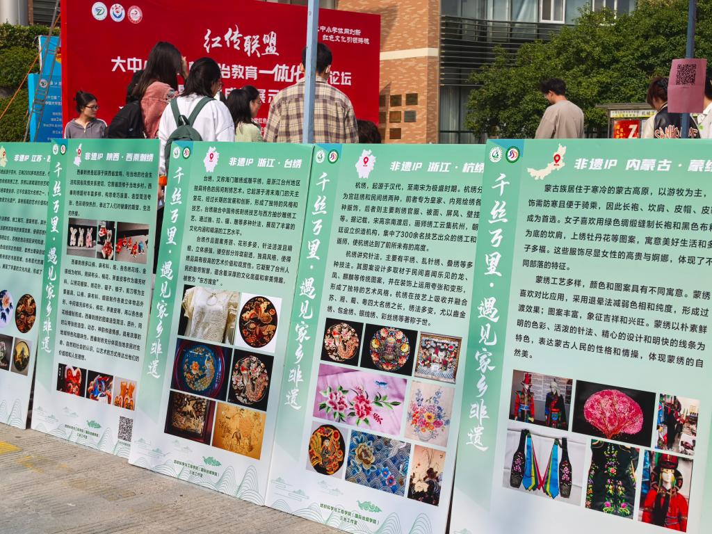 “杭绣,起源于汉代,至南宋时期达到鼎盛,其技艺精湛,令人叹为观止。”“苗族的刺绣和蜡染图案,讲究规整性和对称性,蕴含着丰富的民族文化内涵。”“汴绣则以国画和人物为主要题材,风格富丽堂皇、结构分明、针法细密,特色鲜明,深受人们喜爱。” 活动现场,“三丝”励志志愿服务队成员们热情洋溢地向参加活动的学生们详细介绍着各种绣法的独特魅力。