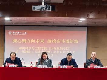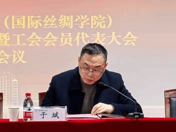 (国际丝绸学院)在大剧院三楼报告厅举行学院第一届教职工代表大会暨工会会员代表大会第四次会议。学院党委书记苏淼、院长于斌、副院长吕汪洋、工会主席唐艳军,学院党政领导、学院工会以及教职工代表等50余人参加会议。