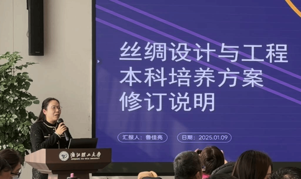 纺织品(丝绸)设计系副主任鲁佳亮针对2024年丝绸设计与工程专业培养方案的优化调整和重要改革举措进行了详细汇报,总结了纺织品(丝绸)设计系2024年度基层教学组织工作的思政建设、学生培养、教研成果等工作,并对2025年专业建设、课程建设、教学与人才培养等工作进行了展望。