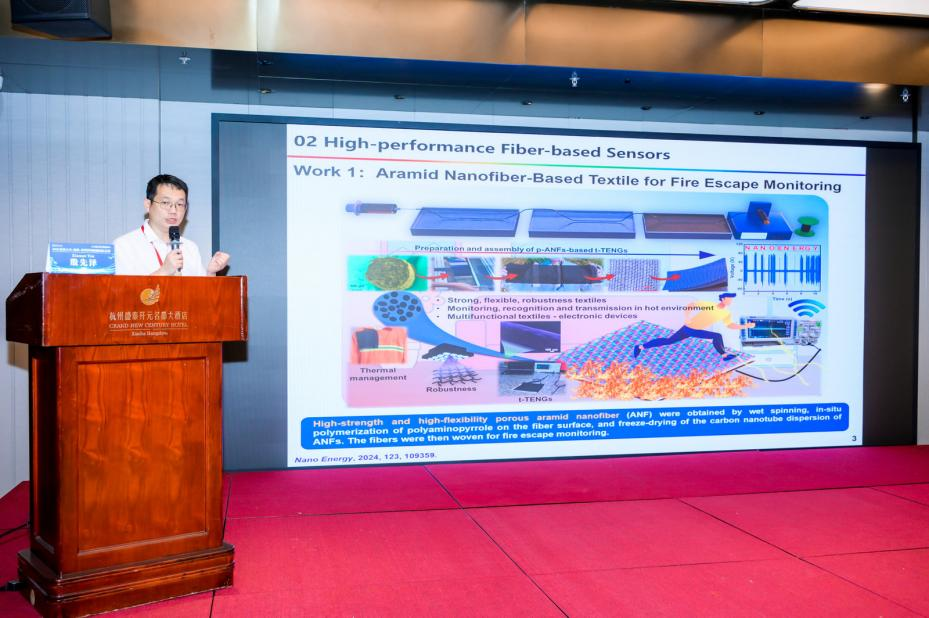在会议报告环节,来自中国、巴基斯坦、英国、日本等国家的学者,围绕“功能纺织品制备与前沿应用”、“自供电纺织传感器设计与制备”、“蛋白质纤维加工与应用”、“可生物降解非织造材料加工”、“水凝胶制备及应用”、“电磁屏蔽用柔性纤维研究进展”、“运动用功能纺织材料制备”、“液晶光子晶体在纺织中的应用”等议题,分享了最新研究成果。现场学术氛围浓厚,研究生们踊跃提问,互动积极。