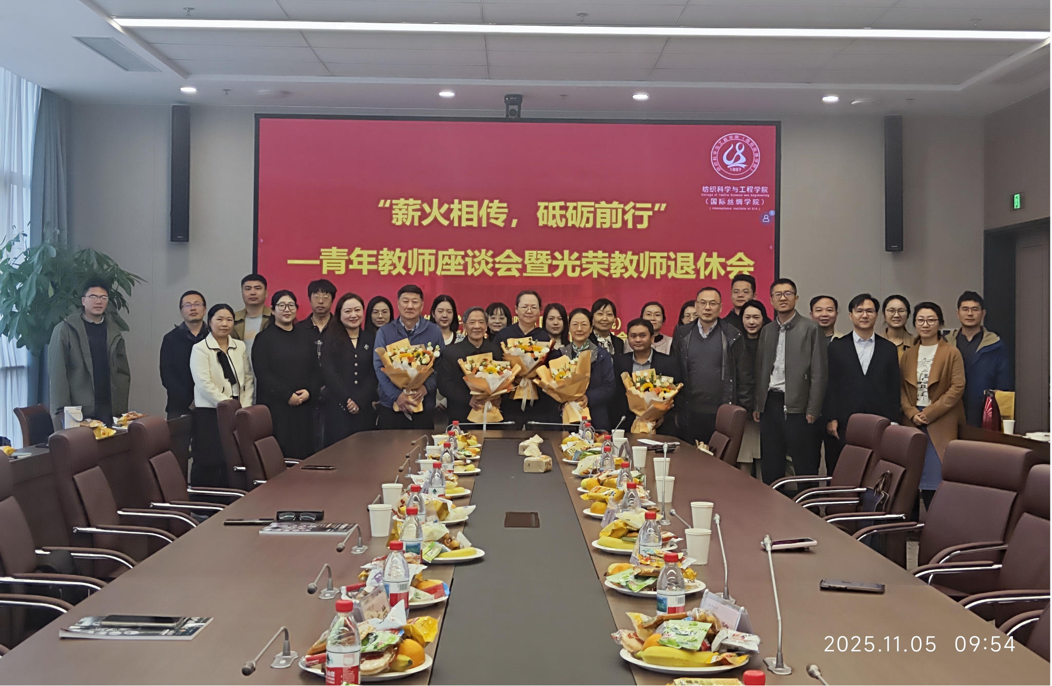 (国际丝绸学院)尊师重教的优良传统,致敬荣休教师的卓越贡献,激励青年教师扎根教坛、奋发有为,纺织学院(丝绸学院)于11月5日上午,在尚+大楼301会议室举办“薪火相传,砥砺前行”青年教师座谈会暨光荣教师退休会。资深教师代表李茂松、陈慰来、王银燕、杨斌、唐志荣出席会议,学院党委书记苏淼、院长于斌、副院长刘国金、学术副院长朱斐超、工会主席王金凤和青年教师代表30余人参加本次活动,致敬荣休岁月,传承师道初心,共绘发展蓝图。