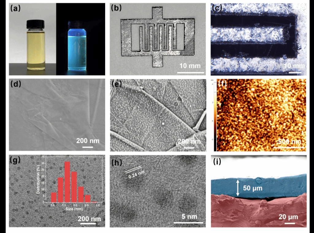 图2 (a)紫外激发前后GQDs溶液的照片;左图在日光下,右图在365nm紫外线下。(b)叉指电极光学图像。c)叉指电极间隙的三维视频显微图像。(d) GP的SEM图像。(e) GP-GQDs的SEM图像。(f) GQDs的AFM图像。(g) GQDs的透射电镜图像。附图为GQDs的尺寸分布。(h) GQDs的HR-TEM。(i) GP-GQDs的SEM横截面图。