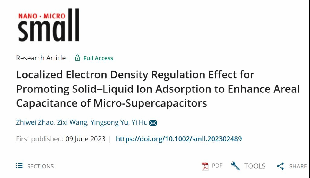 轻化工程系博士生导师胡毅教授课题组报道了利用染整技术中局部电子增强对于染料分子的强化吸附作用机理,通过分步水热法将边缘具有丰富含氧官能团型石墨烯量子点均匀沉积在高导电石墨纸上,结合激光裁切技术制备图案化平面微型储能器件的策略,从电子定域函数(ELF)的拓扑分析和电子密度的角度研究了GQDs的局域电子结构。计算结果显示GQDs结构电子密度具有分布不均匀特性。全碳基柔性GP/GQDs微型超级电容器表现出超高的面积电容(21.78 mF cm-2),以及超长的循环寿命(25000次循环后容量保持率为86.74%),且表现出优异的机械柔性、耐弯曲性以及集成性能。相关工作以“Localized Electron Density Regulation Effect for Promoting Solid–Liquid Ion Adsorption to Enhance Areal Capacitance of Micro-Supercapacitors”为题发表在国际著名期刊Small上,影响因子15.153,DOI:10.1002/smll.202302489。