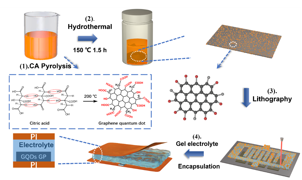 图1 (1) CA热解生成GQDs溶液。虚线框表示热解的具体过程。(2)水热法在预处理的GP上沉积GQDs。(3)光纤激光加工制备叉指电极。(4)凝胶电解质包覆和PI封装形成全固态MSCs。