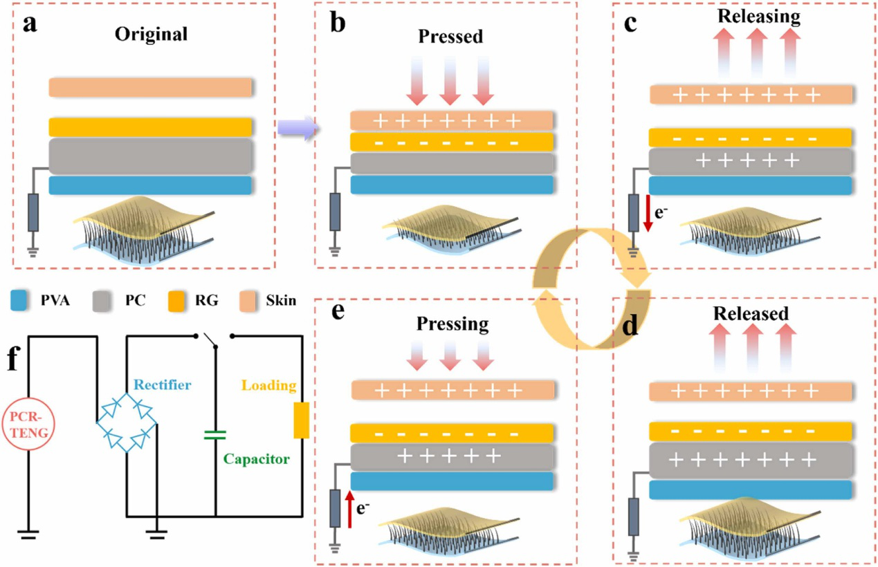 本研究受人体皮肤皮脂层-毛发-表皮层结构的启发,通过3D结构设计成功构筑了单电极摩擦纳米发电机PCR-TENG。PCR-TENG由甘油增 塑的丝素蛋白(RG)薄膜作为摩擦层材料,导电复合棉(PC)纱线与PVA薄膜作为外电路电极材料组成。其中双向生长的、具有仿弹簧结构的PC弹性纱线层具有优异的导电性,而用甘油增塑的RG薄膜作为摩擦负极材料具有优异的电负性和柔韧性。