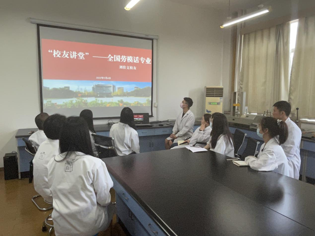 纺织(丝绸)学院轻化工程专业2009届毕业生、全国五一劳动奖章获得者刘佳文校友在工厂车间以线上参会的方式为线下在座的研究生们进行了劳动教育的主题分享。本次讲座活动由学院党委副书记方平主持。