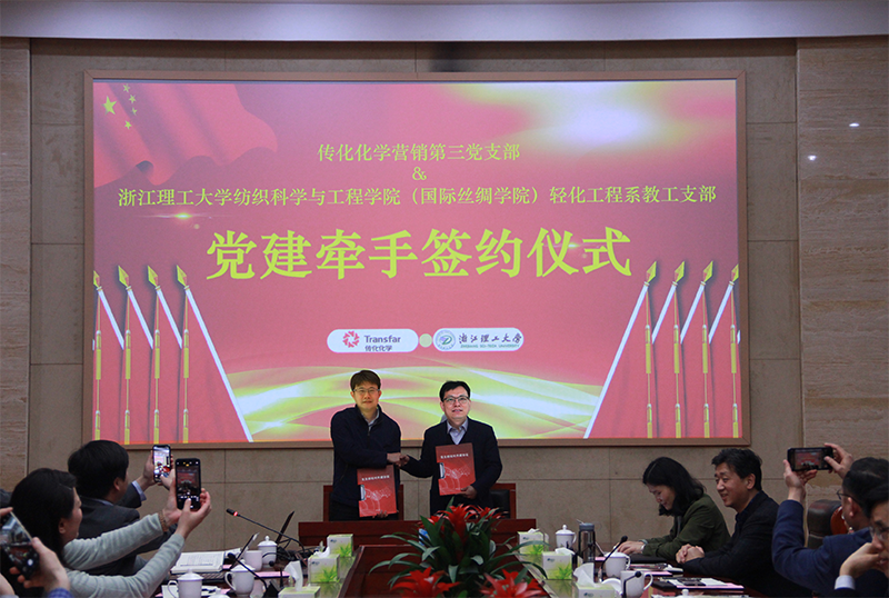 (国际丝绸学院)轻化工程系教工支部与传化化学集团营销第三党支部在“纺化技术创新与应用研究院” 第三期合作课题开题之际,举行支部结对的党建牵手仪式,将双方的合作广度和深度推向更高水平。校企两方支部书记就课题研究、参访学习、人才培养等各方面的合作进行了细致的探讨和深入的交流。轻化工程系教工支部书记胡毅针对传化积极响应国家强化科技创新体系构建能力的号召、促成双方资源共享、优势互补、强化基层党支部建设所做的努力表达赞赏和感谢。传化化学集团营销第三党支部书记金泽表示企业十分重视产学研合作的优良传统,希望能通过此次双方党支部的牵手共建,将党支部的堡垒作用和党员的旗帜作用在双方的课题合作中淋漓尽致得展现出来,为技术与市场的深度融合创建更广阔的平台。在党建牵手签约仪式之后,传化化学集团课题负责人与学院教师针对课题合作中所提到的研究思路和研究方法等进行了深入的讨论和分析,并结合染厂实例剖析实践应用的便捷性。在互换意见的过程中,双方进一步明晰了课题的研究思路、明确了研究方向和研究方法,为课题的顺利开展奠定了基础。今后双方支部会进一步加强互访交流,增加合作维度,为之后开展更深层次的校企合作做好积累。