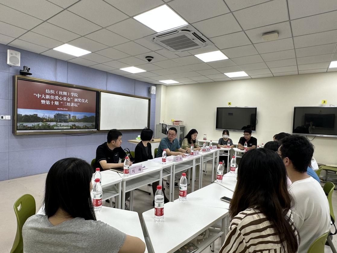 (国际丝绸学院)“中大新佳爱心基金”颁奖仪式暨第十期“三丝讲坛”—校友导师面对面座谈交流会中,中大新佳奖助学金获得者代表们围绕学业、就业、职业规划等主题纷纷提问,82届校友、浙江中大新佳贸易有限公司董事长叶子一一耐心解答。学院党委副书记方平、资助中心辅导员张虹、校友联络中心辅导员袁紫琳一同参加,活动由方平主持。