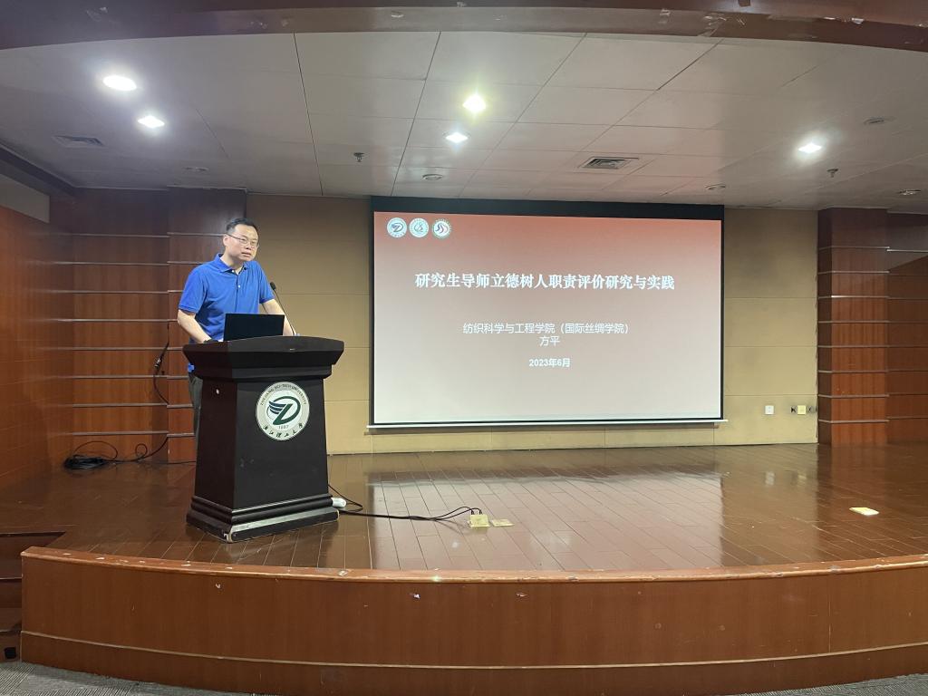 学院党委副书记方平解读《纺织科学与工程学院(国际丝绸学院)研究生导师立德树人职责评价办法》,期间,他结合前期研究和调查实践,系统解读《关于全面落实研究生导师立德树人职责的意见》、《研究生导师指导行为准则》等文件精神,阐明评价办法产生机制的政策导向,并从过程性、导引性、多维性和发展性四个方向对研究生导师立德树人职责评价办法三级指标进行“实战式”解读。