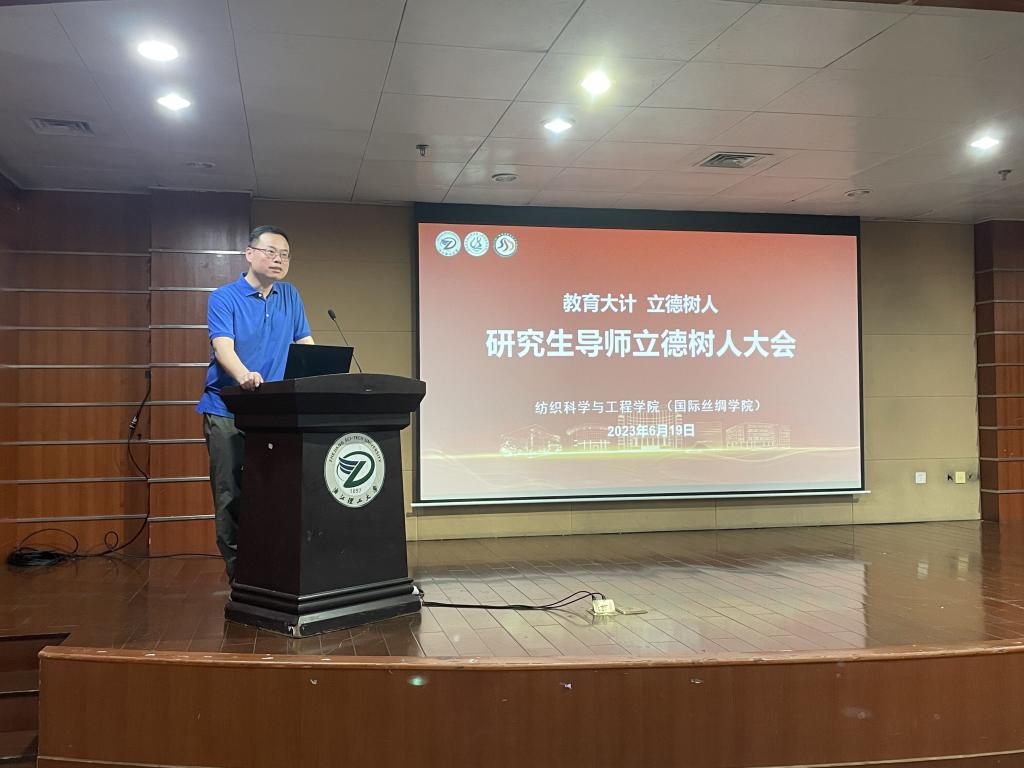 在全国上下、全校上下深入开展“学习贯彻习近平新时代中国特色社会主义思想主题教育”之时,结合前期研究生教育相关工作调研成果,同时推动全面落实研究生导师立德树人根本任务,促进研究生导师自身素养、指导水平和培养质量的提升。6月19日,纺织科学与工程学院(国际丝绸学院)在大剧院三楼报告厅举行首届“研究生导师立德树人大会”。研究生院院长傅雅琴,学院党政班子,全体研究生导师、研究生辅导员和研究生教学秘书参加,会议由党委副书记、纪委书记方平主持。