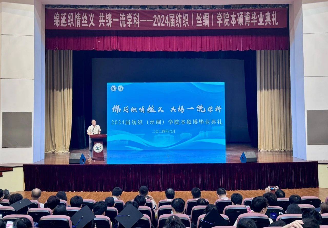 在全国上下深入贯彻党的二十大精神,喜迎中华人民共和国成立75周年之际,2024届毕业生迎来了自己的毕业季。6月12日上午,纺织(丝绸)学院在学校小剧院举行2024届毕业生毕业典礼。校友企业代表、浙江中大新佳贸易有限公司综合部经理刘峰受邀出席典礼,学院党委书记徐伟强、学院院长于斌、学院党委副书记方平、各系负责人、2024届班主任、硕博导师、辅导员、2024届本硕博毕业生以及低年级学生代表参加活动。活动由学院党委副书记方平主持。