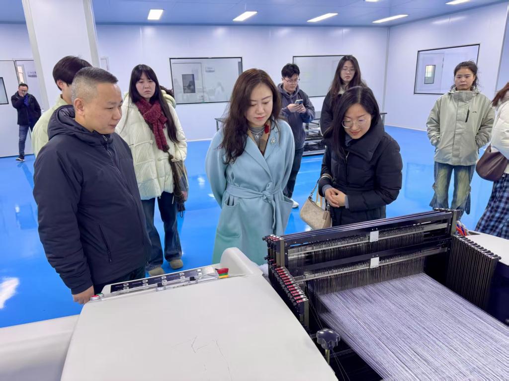 为进一步开拓就业渠道,调研企业需求,推进校企协同育人,扎实做好“访企拓岗”专项行动,2月19日上午,纺织(丝绸)学院党委书记苏淼、党委副书记张孝凤一行赴浙江东进新材料有限公司走访调研。浙江东进新材料有限公司副总经理谢国炎、人事经理沈碧颖、研发经理乔路阳以及在企业工作的校友代表热情接待师生一行。