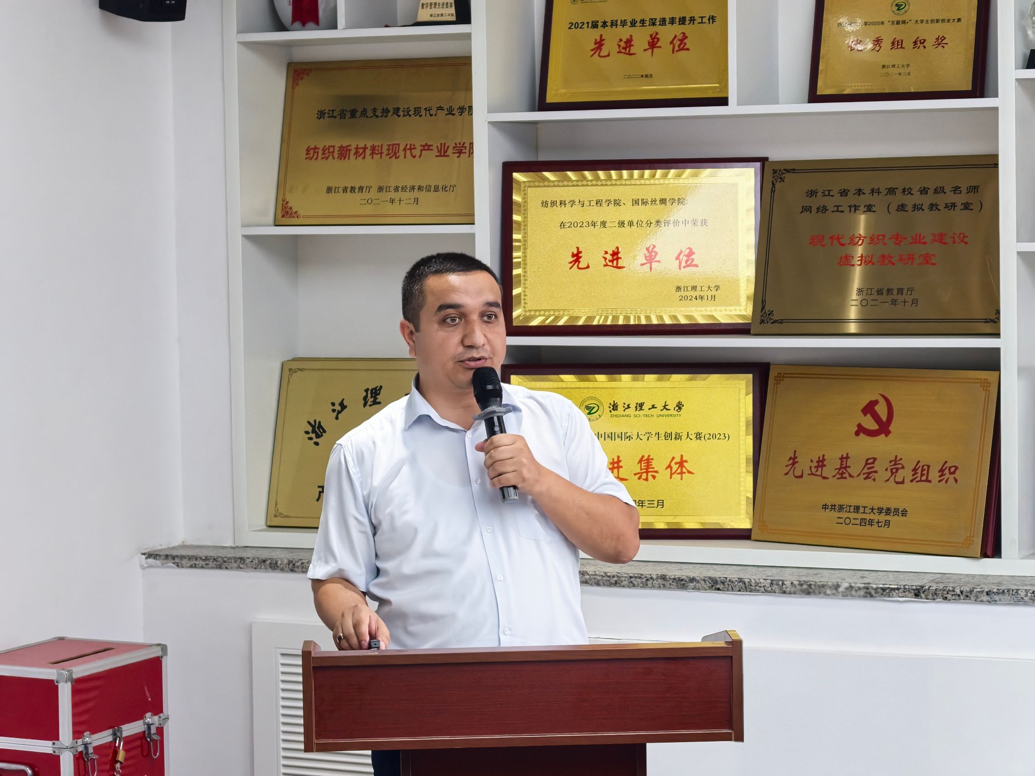 开班典礼上,于斌院长首先致辞,对15名远道而来的学员表示热烈的欢迎,作为国内历史最悠久的纺织服装特色院校,希望通过大家的共同努力,推动两校在新型纺织材料与先进加工技术领域的科技合作与人才交流。武观副处长就我校的基本情况、办学历史、国际化工作做了简要的介绍。培训班项目负责人刘国金副院长简要介绍了学院办学历史、专业设置及学院国际交流合作等方面内容。塔什干纺织与轻工业学院化学系系主任Davlatov Bekzod教授简单介绍学校,希望双方未来开展师生交流互访,以丝绸文化为媒,促进两校科技人文交流。此外,项目班主任王琰老师就培训班的教学安排作了详细的介绍。