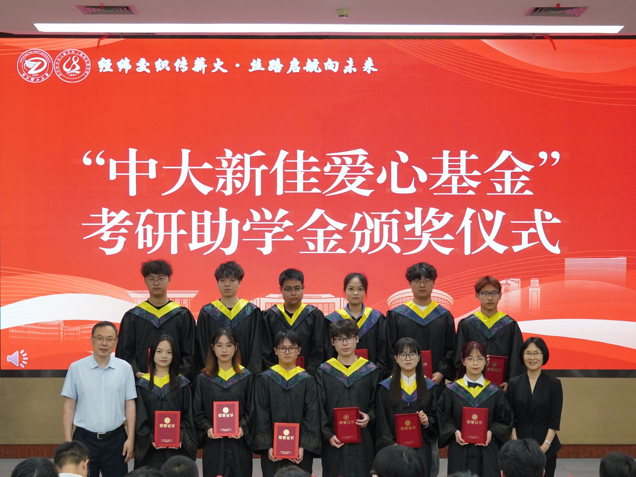 典礼上,浙江中大新佳贸易有限公司董事长叶子和于斌为学子们颁发“中大新佳爱心基金”考研助学金。