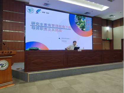 学校研究生院学位办公室主任佟自光进行了研究生教育管理视角下的导师责任及挑战主题报告。他呼吁导师要与研究生保持密切沟通,与研究生建立信任关系,强调“研究生导师不仅仅是学术的指导者,更应该是学生心灵的守护者”。