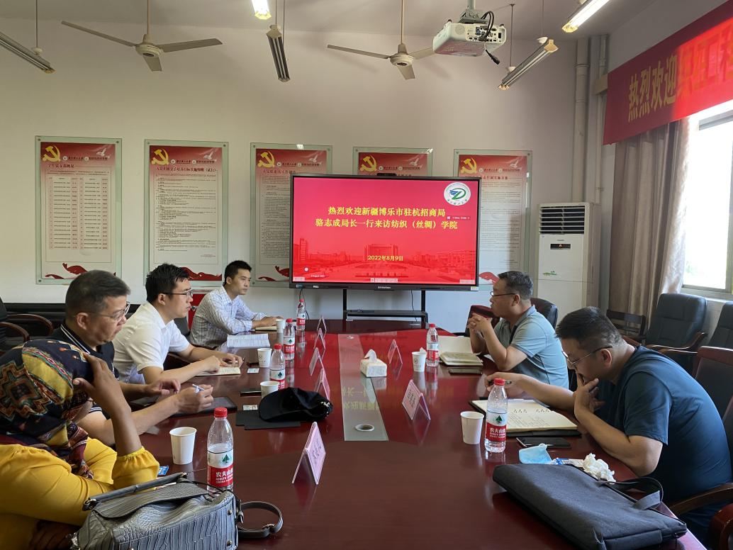 8月9日上午,新疆博乐市驻杭州招商局骆志成局长、白英奎副局长来纺织(丝绸)学院访问交流。学院副院长余厚咏、纺织品(丝绸)设计系主任金子敏、教学科研办公室主任顾越桦、纺织材料系马明波、非织造工程系苏美儿等教师代表参加了交流会。
