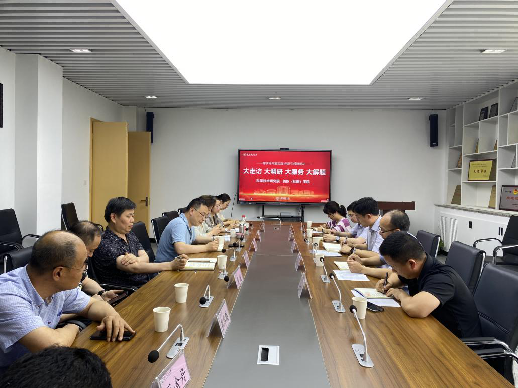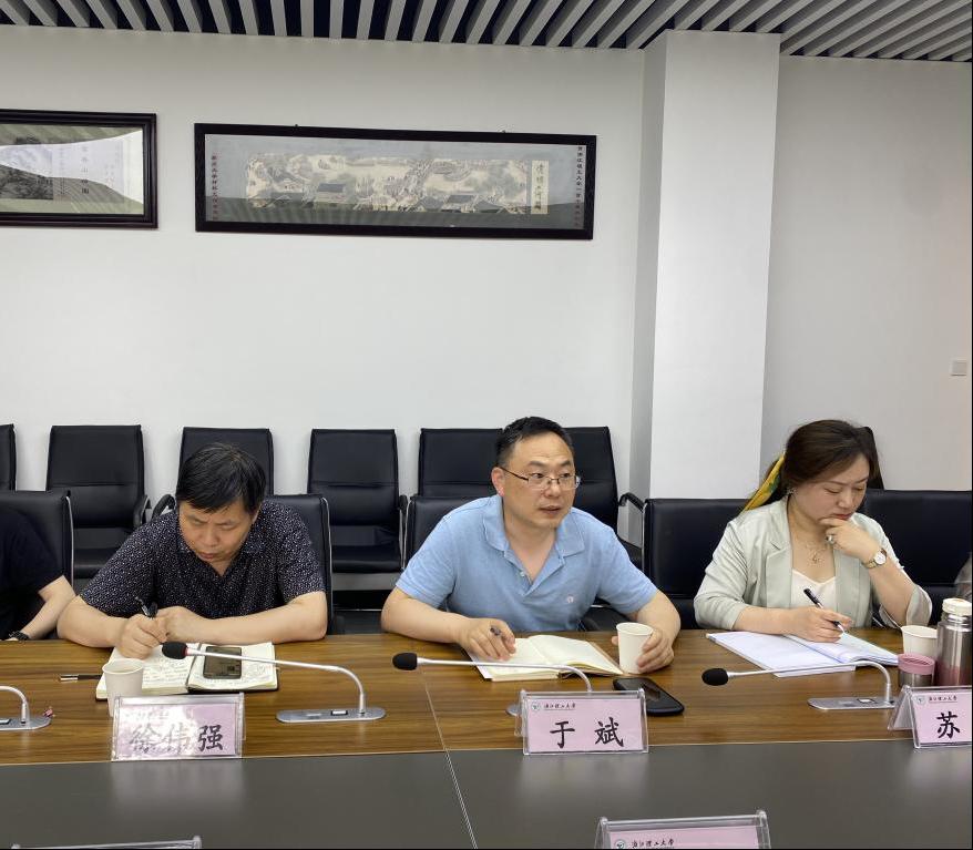 (国际丝绸学院)调研交流。学院党委书记徐伟强、院长于斌、副院长苏淼、各系主任、校内研究机构负责人、教科办主任等参加了会议。会议由院长于斌主持。