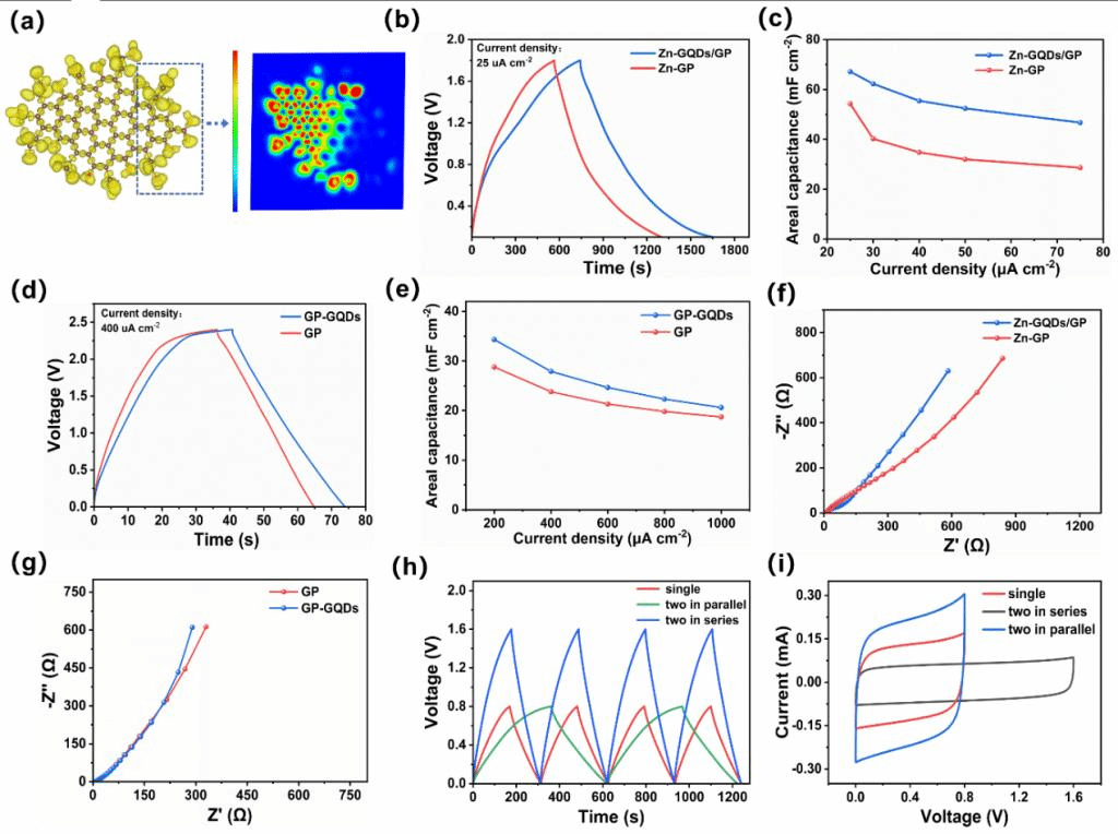 图4 (a) GQDs结构体系的不同电子密度分布。(b)固态ZnSO4/CMC凝胶电解质中锌离子杂化MSCs的GCD曲线和(c)面电容图。(d)固态EMIMBF4/PVDF-HFP凝胶电解质中MSCs的GCD曲线和(e)面电容图。(f)和(g)不同类型设备的EIS测试。(h)单个、两个串联和两个并联MSCs的GCD和(f) CV图。