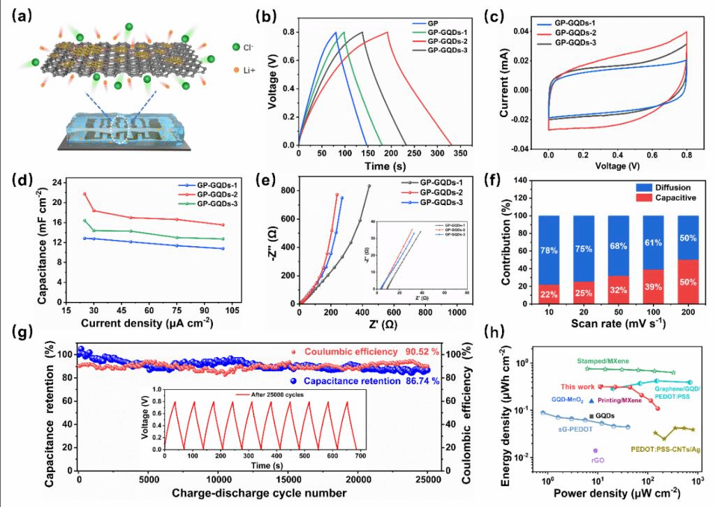 图3 (a) GP-GQDs MSCs示意图。(b)不同前驱体负载的GP-GQDs MSCs的GCD曲线和(c) CV曲线。(d) GP-GQDs-2 MSC的面电容随电流密度变化的曲线。(e)不同前驱体负载对应的GP-GQDs MSCs的Nyquist图。(f)不同扫描速率下GP-GQDs-2 MSCs电容容量的归一化贡献率。(g)在25 μA cm-2的固定电流密度下测量的循环稳定性(插图:循环后的GCD曲线)。(h)比较不同MSCs电化学性能Ragone图。
