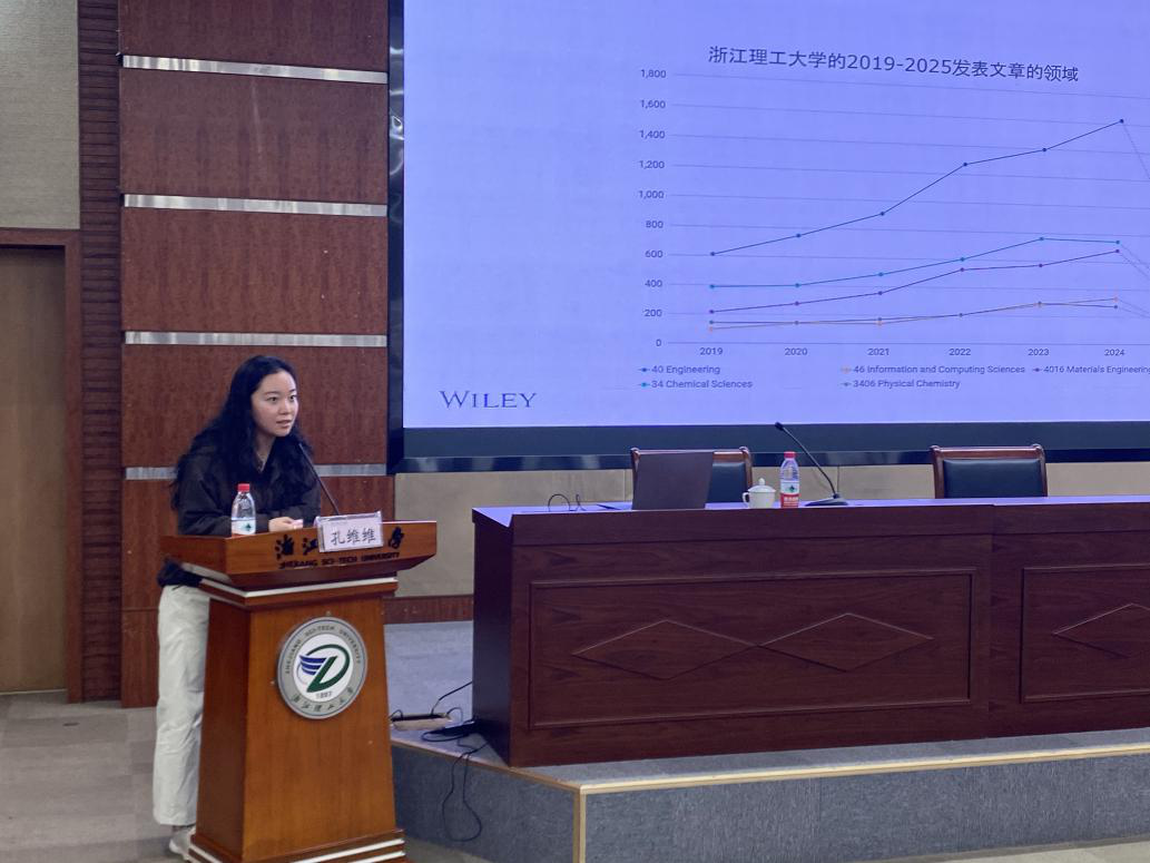 孔维维主编在报告中分析了浙江理工大学老师和学生近几年在 Wiley材料科学期刊投稿和发表的数量情况、集中的专业领域,同时重点介绍了本人承担主编和编辑的几本期刊的情况。