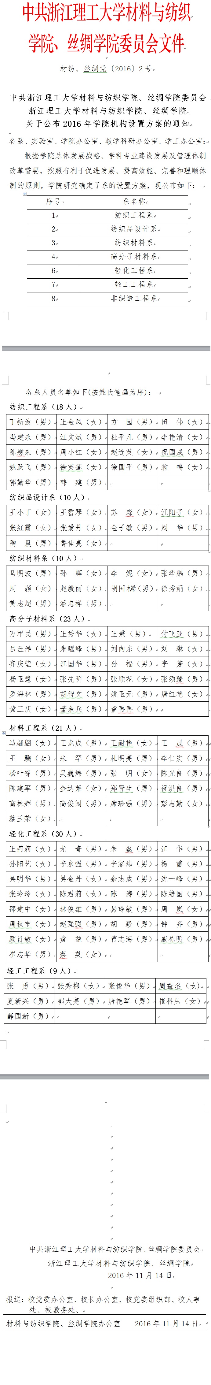 中共浙江理工大学材料与纺织学院、丝绸学院委员会浙江理工大学材料与纺织学院、丝绸学院关于公布2016年学院机构设置方案的通知