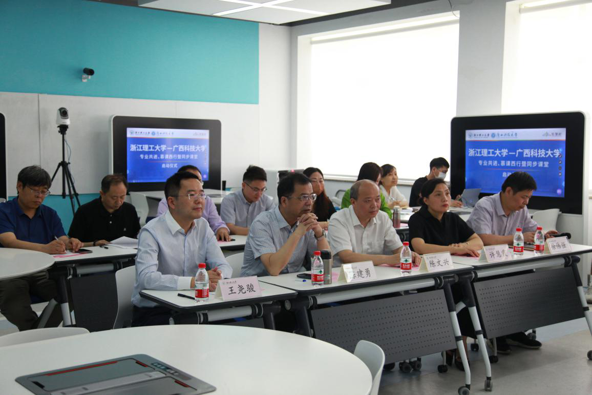 6月7日上午,在校智慧教室,浙江理工大学和广西科技大学师生齐聚云端,开展“专业共进、慕课西行暨同步课堂活动”启动仪式,同时在学校大力支持下,浙江省现代纺织专业建设虚拟教研室现场启动并开展了同步课堂教学活动。校长陈文兴,副校长许慧霞,原副校长陈建勇,纺织科学与工程学院(国际丝绸学院)、材料科学与工程学院、国际教育学院等有关领导和老师;广西科技大学副校长秦小云,教务处处长秦福利,生物与化学工程学院、天虹现代纺织产业学院等有关领导和老师出席了启动仪式。启动仪式由教务处处长王尧骏主持。